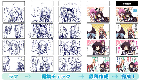 『echo.』の4コママンガは、基本的には商業作品の制作と同じ手順で作られています。「じゃあどういう手順で作るの?」と疑問に思ったアナタのために、簡単にご説明します!