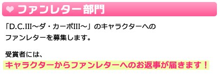 「D.C.III~ダ・カーポIII~」のキャラクターや世界観に関連した、イラストおよびファンレターを募集します。