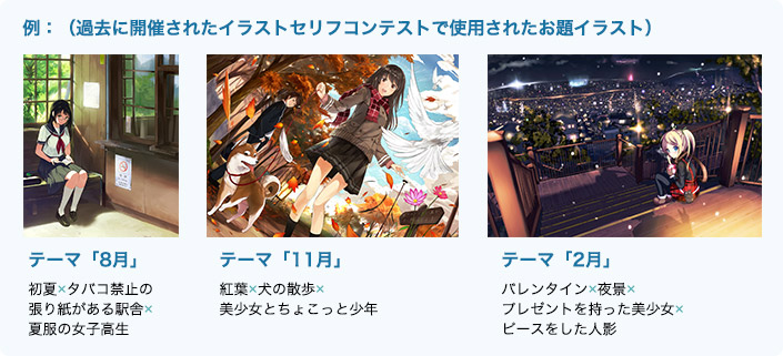 受賞作品については、小説投稿「E★サイトエブリスタ」で開催される、投稿イベント「超・妄想コンテスト イラストにセリフをつけよう!」のお題としてイラストが使用されます。 6月賞…1人 イラスト採用+QUOカード5,000円分 7月賞…1人 イラスト採用+QUOカード5,000円分 8月賞…1人 イラスト採用+QUOカード5,000円分 |