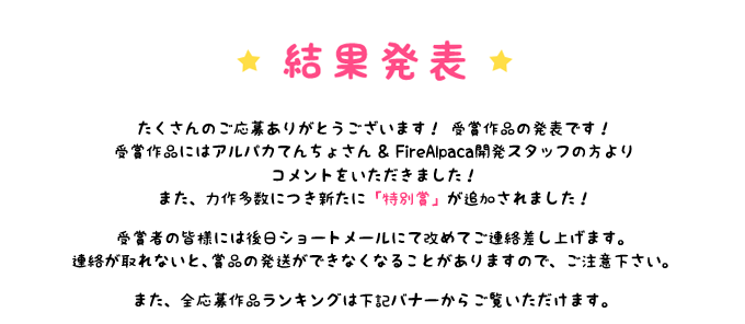 「FireAlpaca」制作スタッフによる選考 最優秀賞:1名 優秀賞:3名 |