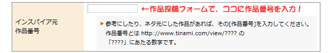 元ネタにしたり参考にした作品がTINAMIの投稿作品内にある場合、その作品の番号を入れて投稿すると、