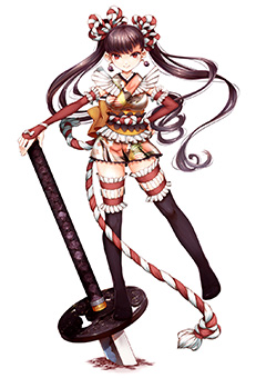 不敵な少女剣士の表情とポーズ、思い切った武器の大きさが目を惹きました。衣装も、和服や和のモチーフを分析した上で、それらを組み替えてオリジナリティを出しているところがすごいですね。七五三縄の質感のリアリティにも脱帽です。