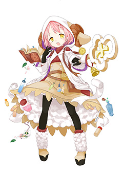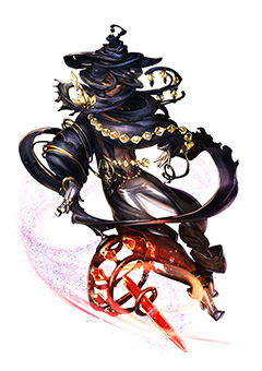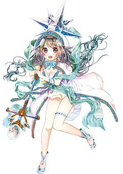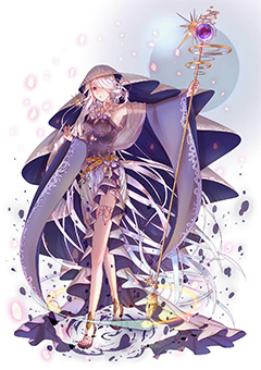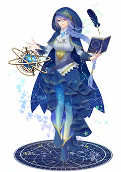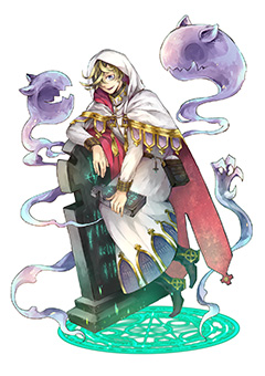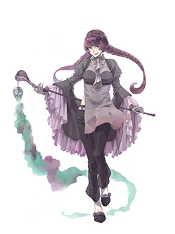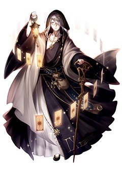 目のモチーフを、大小のメリハリを付けて配置した衣装が独特で面白いですね。配色やポーズからも、幼く見えるが一筋縄ではいかない賢者、といった存在感が醸し出されています。