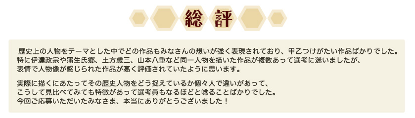 「戦幕フェスティバル2012」実行委員会による選考 「戦国部門」優秀賞:3名 「幕末部門」優秀賞:3名 ※ 20歳未満の方には「特産ぶどうジュース」が贈られます。20歳以上の方でも、ご希望の場合は「特産ぶどうジュース」をお届けします。 ※放射性物質の全袋検査を行い、基準値をクリアしたものだけをお届けします。 |