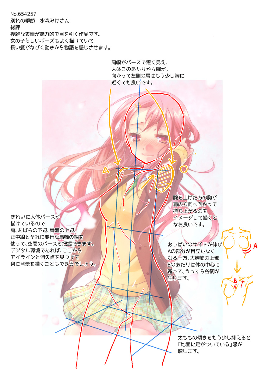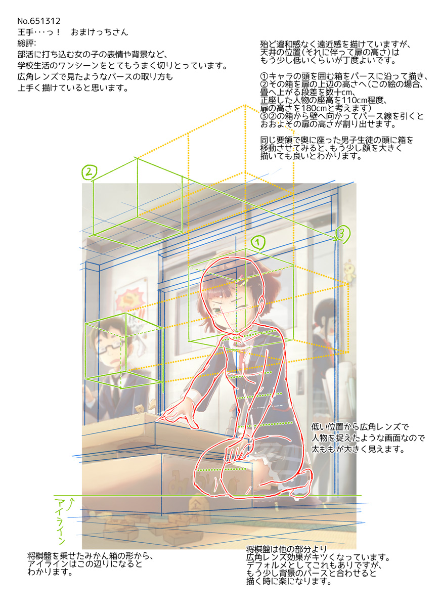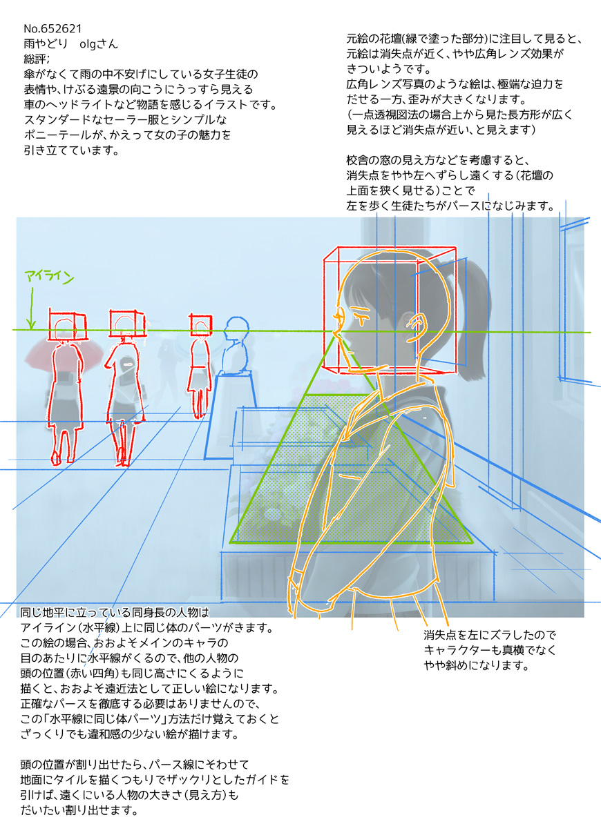 部活に打ち込む女の子の表情や背景など、学校生活のワンシーンをとてもうまく切り取っています。広角レンズで見たようなパースの取り方も上手く描けていると思います。
