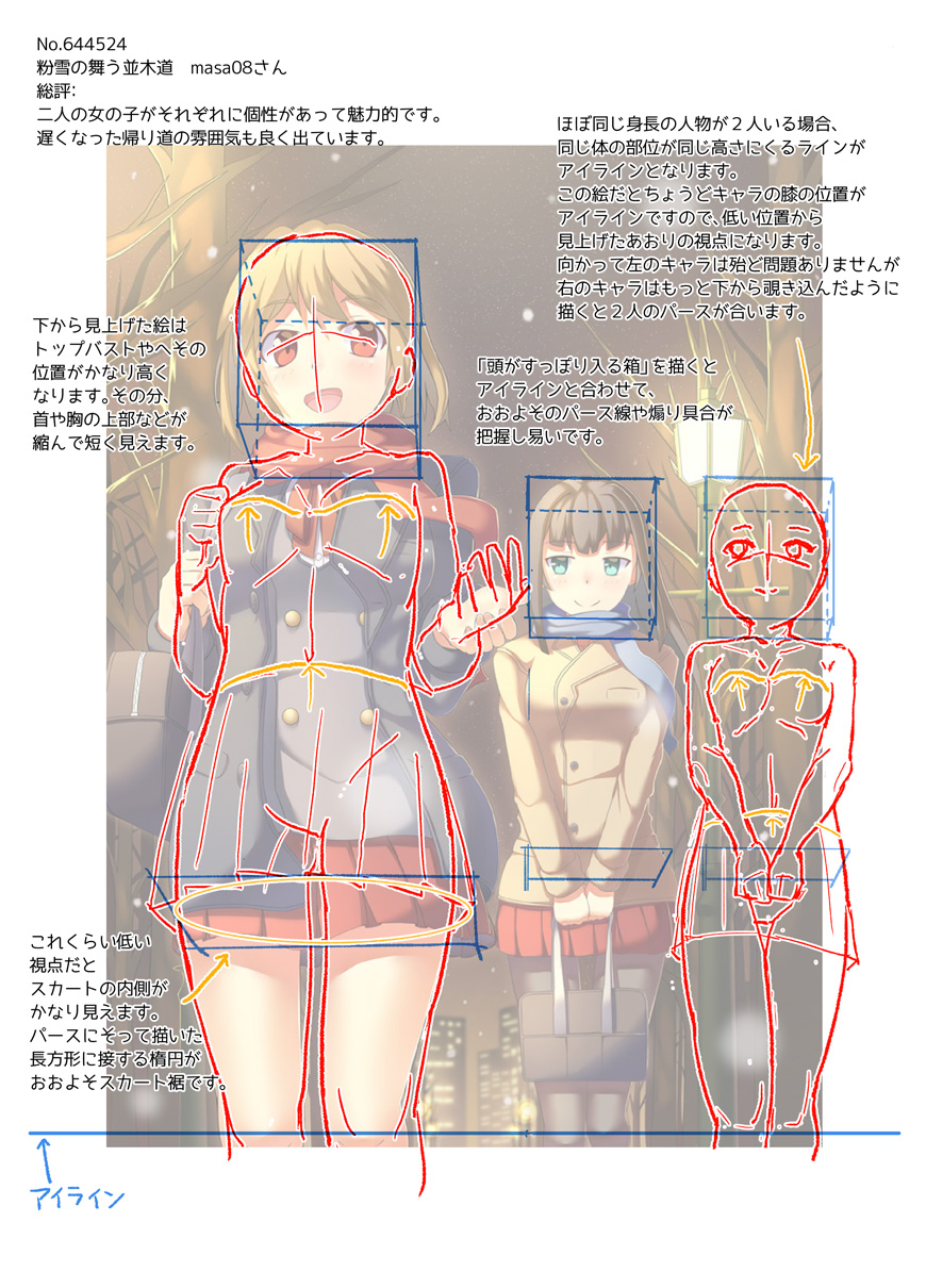 寒さで肩をすくめた様子や、冬らしい色彩、コートをだぶっと着た女の子など、とても魅力的に描けています。