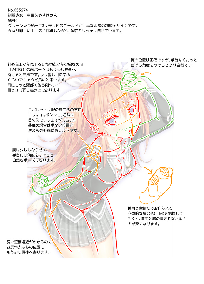 グリーン系で統一され、差し色のゴールドが上品な印象の制服デザインです。かなり難しいポーズに挑戦しながら、体幹をしっかり描けています。