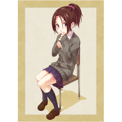 女の子の可愛さ、教室での何気ない一瞬を思わせるシチュエーション、ともに良く描けている作品だと思います。胸を強調するコルセット的なパーツも、ベストにアレンジしたことで制服のデザインに違和感なくなじんでいます。