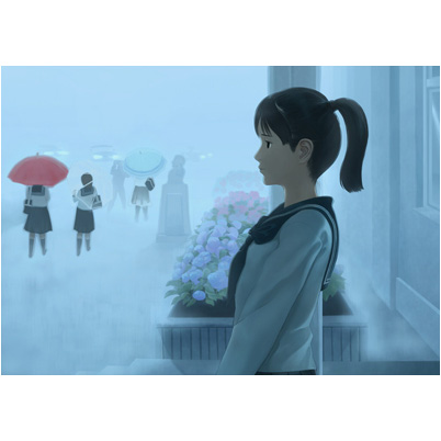 傘がなくて雨の中不安げにしている女子生徒の表情や、けぶる遠景の無効にうっすら見える車のヘッドライトなど物語を感じるイラストです。スタンダードなセーラー服とシンプルなポニーテールが、かえって女の子の魅力を引き立てています。
