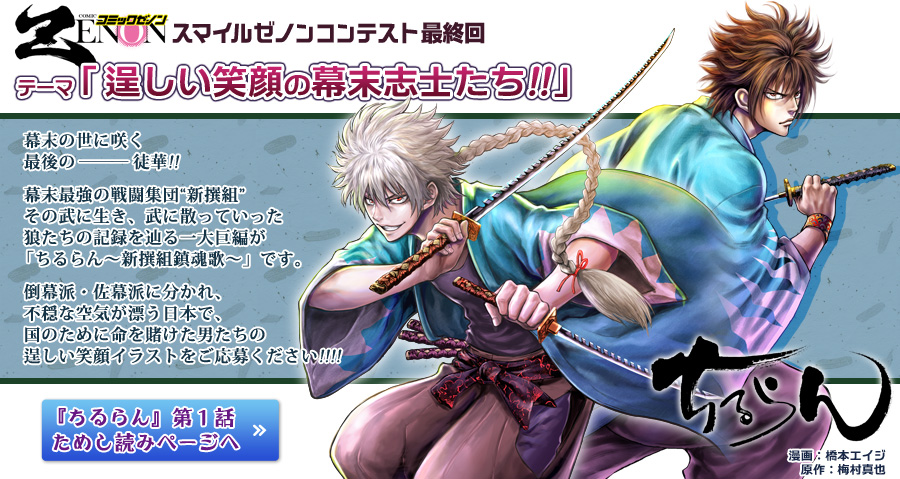 - 志士の見かけや性格などは、「月刊コミックゼノン」誌上で掲載中の『ちるらん』に基づくか、 史実に着想を得た応募者独自のイメージでお願いいたします。 『ちるらん』以外の作品の二次創作設定の利用は禁止です。
