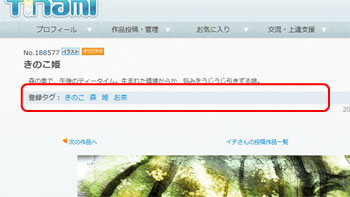 また、作品ページにも登録タグが表示されていますので、もっとこのタグに関連する作品が見たい!と思った時は、そのタグをクリックすればOK。